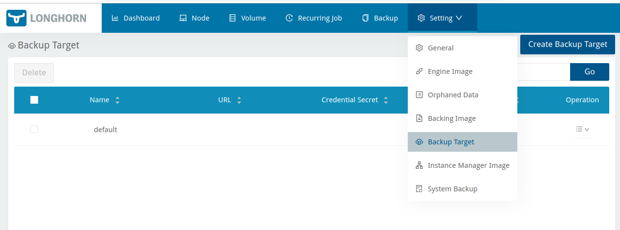 On the Longhorn UI, go to Setting > Backup Target, and then create or edit a backup target.