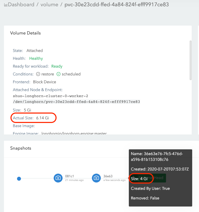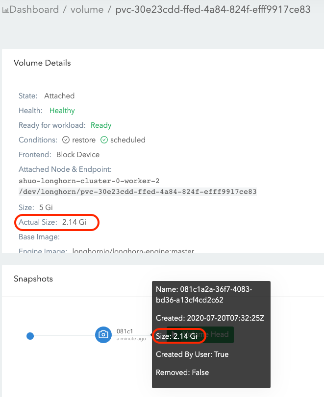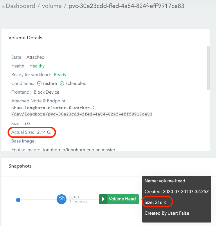 size is 5Gi and the actual size is almost 0.actual size is not exactly 0.actual size is still 2Gi.