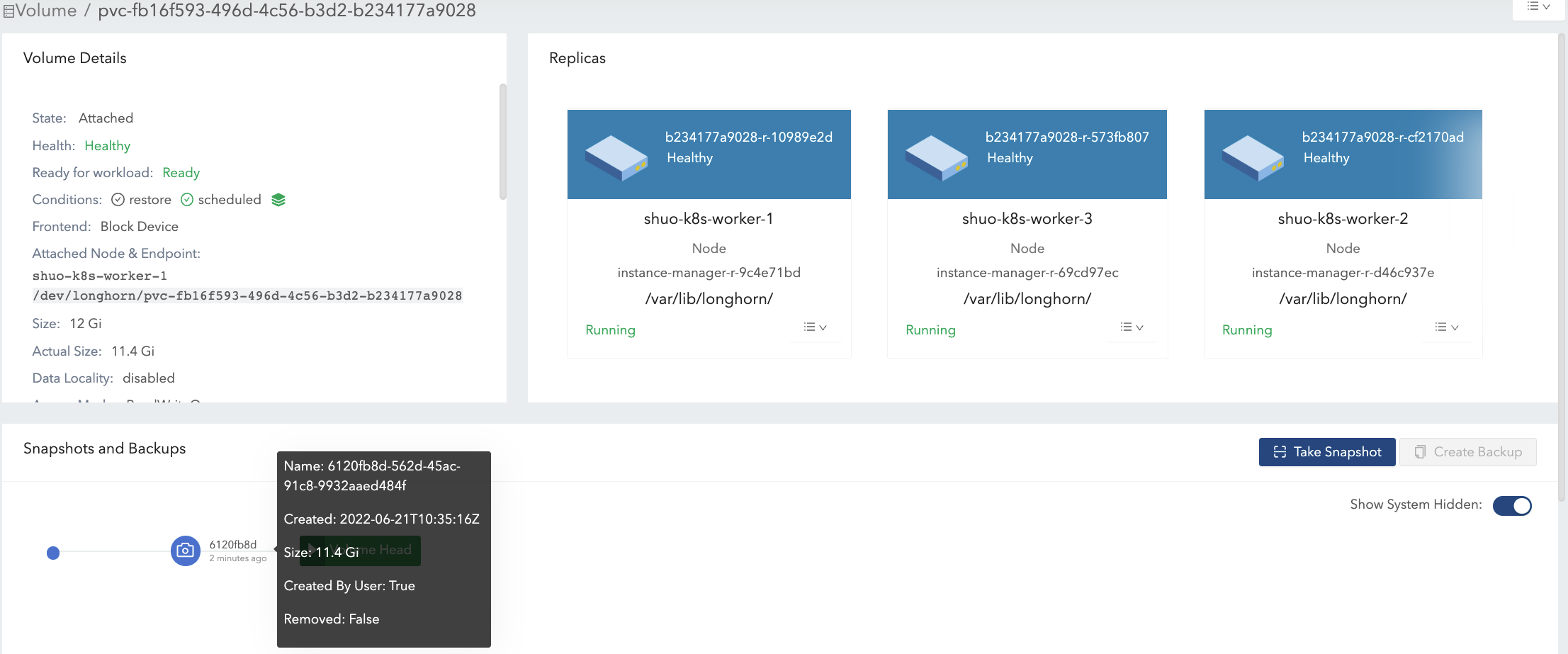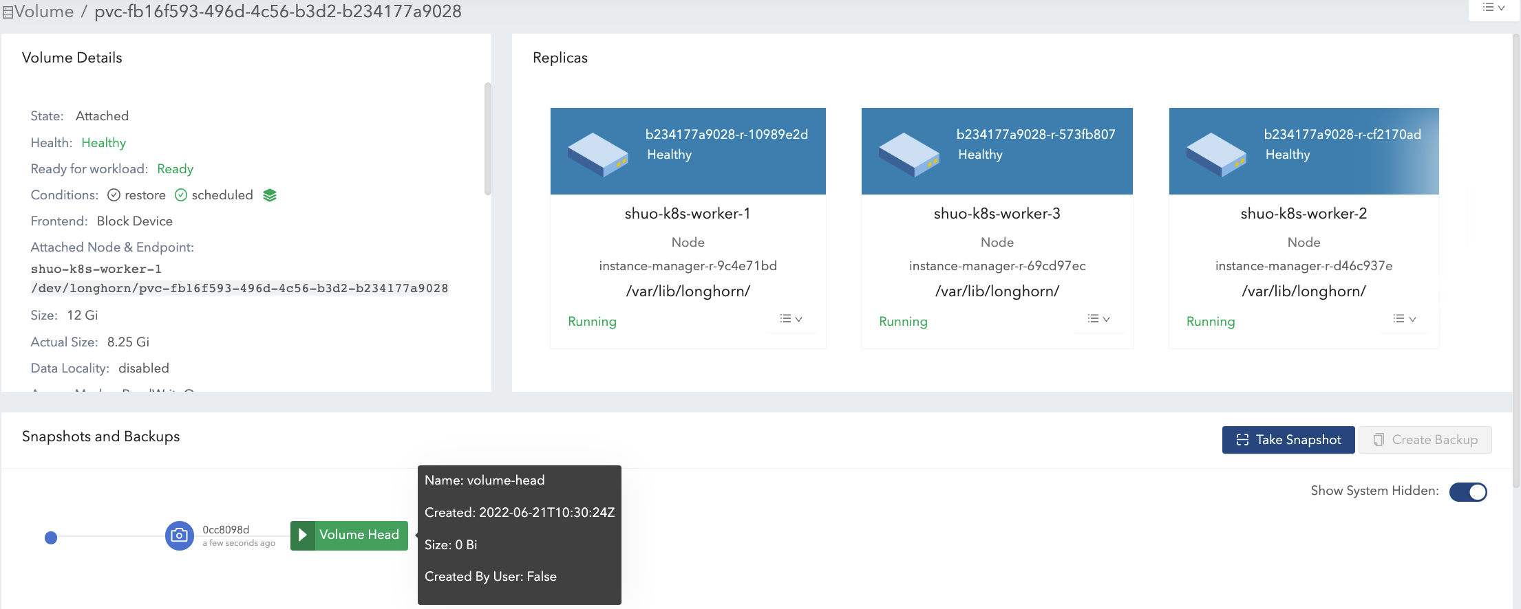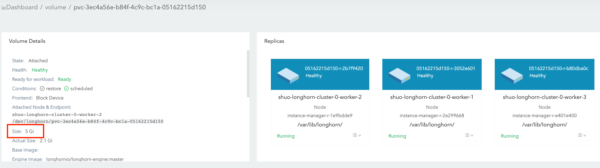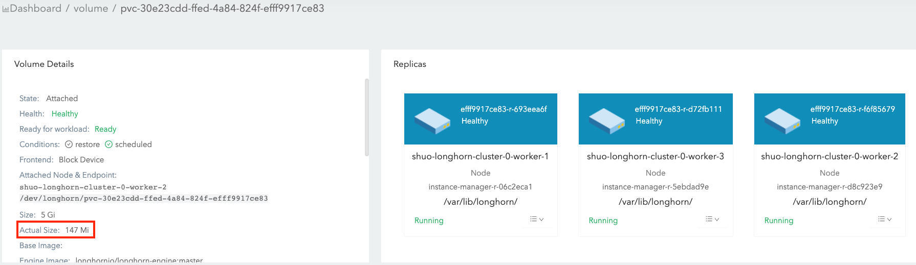 actual sizeis not shrunk after deleting the 4 Gi data. Longhorn is a block-level storage system. Therefore, the deletion in the filesystem only marks the blocks that belong to the deleted file as unused. Currently, Longhorn does not support TRIM/UNMAP operations, so thediscardmount option orfstrimin the filesystem layer cannot reclaim the unused blocks. In consequence, the actual size of Longhorn volumes cannot be shrunk in this case.